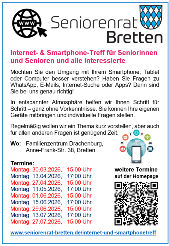 Wenn Sie Anregungen haben oder sich mit Seniorinnen und Senioren in Bretten austauschen möchten, kommen Sie gerne auf ein „Schwätzle“ vorbei!
