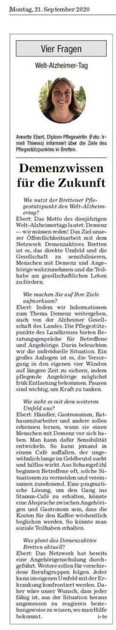 Interview in den Brettnerer Nachrichten zum Welte Alzheimertag 2020